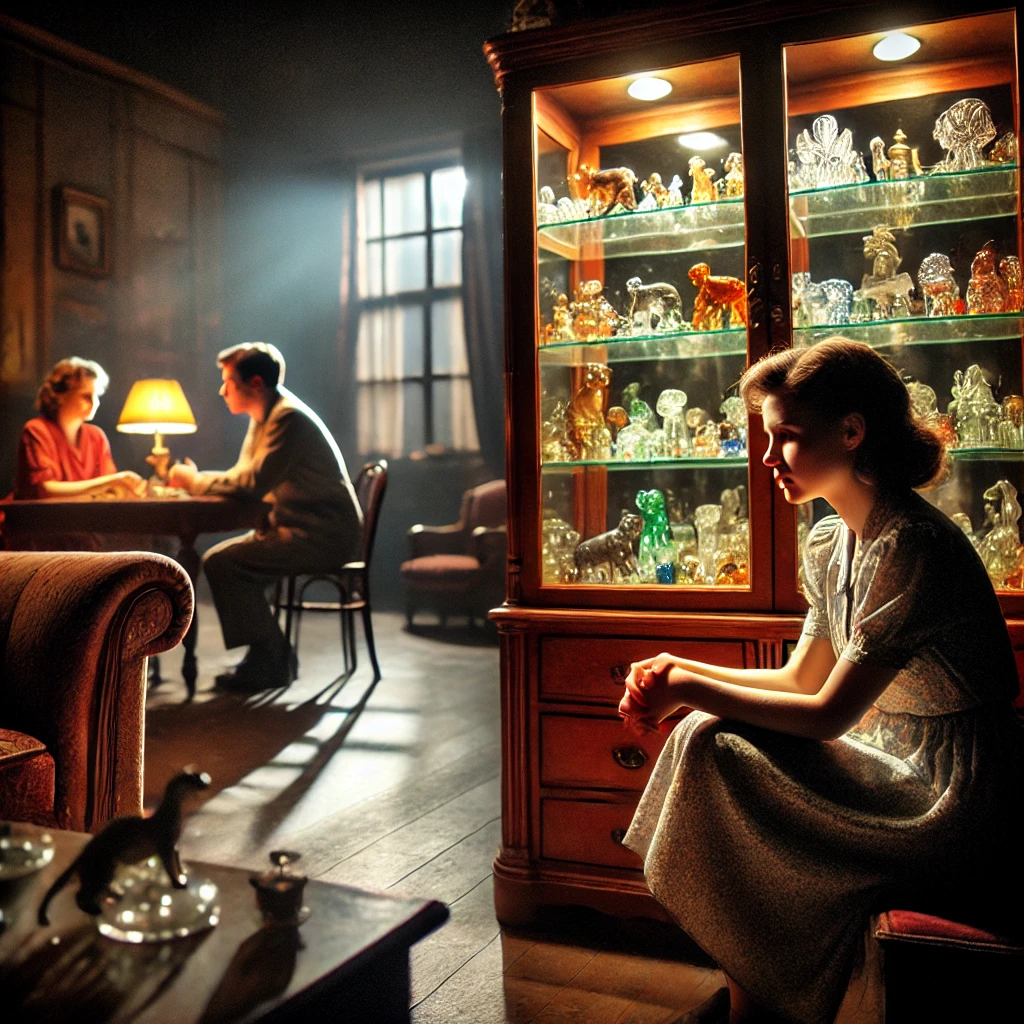 주인공 톰 윙필드는 신문 배달을 하며 가족을 부양하는 청년입니다. 그는 집안의 유일한 생계책임자로서 어머니 아만다와 내성적인 여동생 로라와 함께 살고 있습니다. 아만다는 과거 남부 귀족 출신으로, 자신의 젊은 시절과 과거 영광을 되새기며 로라에게도 사교성과 결혼을 강요합니다. 하지만 로라는 심한 대인기피와 신체적 장애로 외부 세계와의 교류를 힘들어하고, 자신의 작은 유리동물 수집품에만 몰두하며 현실을 회피합니다.